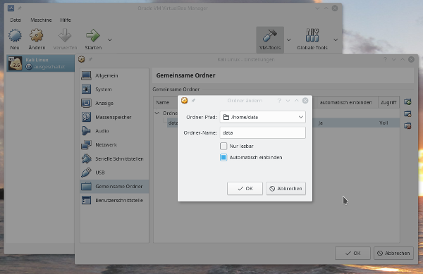 To do this, select your Kali Linux VM instance in the VirtualBox Manager and open the "Shared Folders" menu under "Change" in Settings. In the right pane, there is a Plus folder icon that opens a pop-up window to add shared folders. Here you select the desired folder and give it a new name. Activate the checkboxes for "Auto mount" and close the process each time you confirm with "OK".