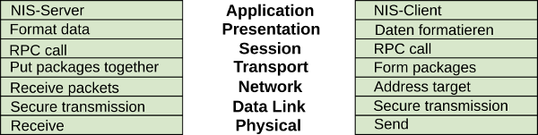 The NIS client sends a request. Since he can not know the data format understood by the server, he brings this into a general format (in connection with RPC, External Data Representation XDR is mostly used). The remote procedure call organizes the "remote procedure call" by packaging the data along with information about the desired service. At the transport level u.a. the data is broken down into blocks of a certain size, the switching takes over the addressing of the target computer at the IP level. The backup layer is quite hardware specific and takes care of the error-free transmission on the actual medium. Finally, the transmission is via a physical medium whose characteristics are specified by the transmission layer protocol. On the server side, the layer 2 packet is handed over. If this detects the absence of errors, it reaches the network layer. At the transport level, the packets generated by the sender are combined to form the complete message. The RPC server process evaluates the requirements. If they can be fulfilled, the data is transferred to the required format and the NIS server is consulted. This generates an answer and the game repeats itself with distributed roles ...