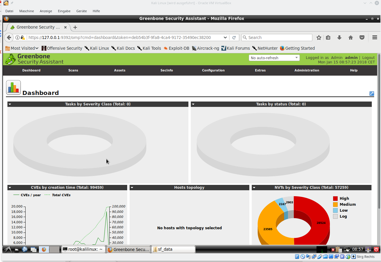 Sofern Sie es noch nicht getan haben, vergewisseren Sie sich, dass das Kali Linux auf dem neuesten Stand ist und installieren Sie das neueste OpenVAS. Wenn Sie fertig sind, führen Sie den Befehl openvas-setup aus, um OpenVAS zu konfigurieren. Dabei laden Sie automatisch die neuesten Regeln herunter, erstellene inen Admin-Benutzer und starten Sie die verschiedenen Dienste. Je nach Bandbreite und Computerressourcen kann dies eine Weile dauern.